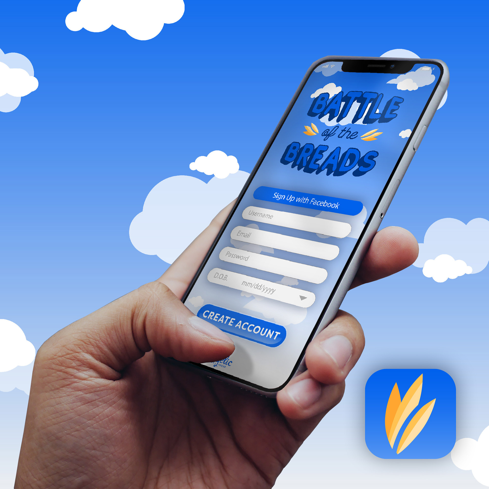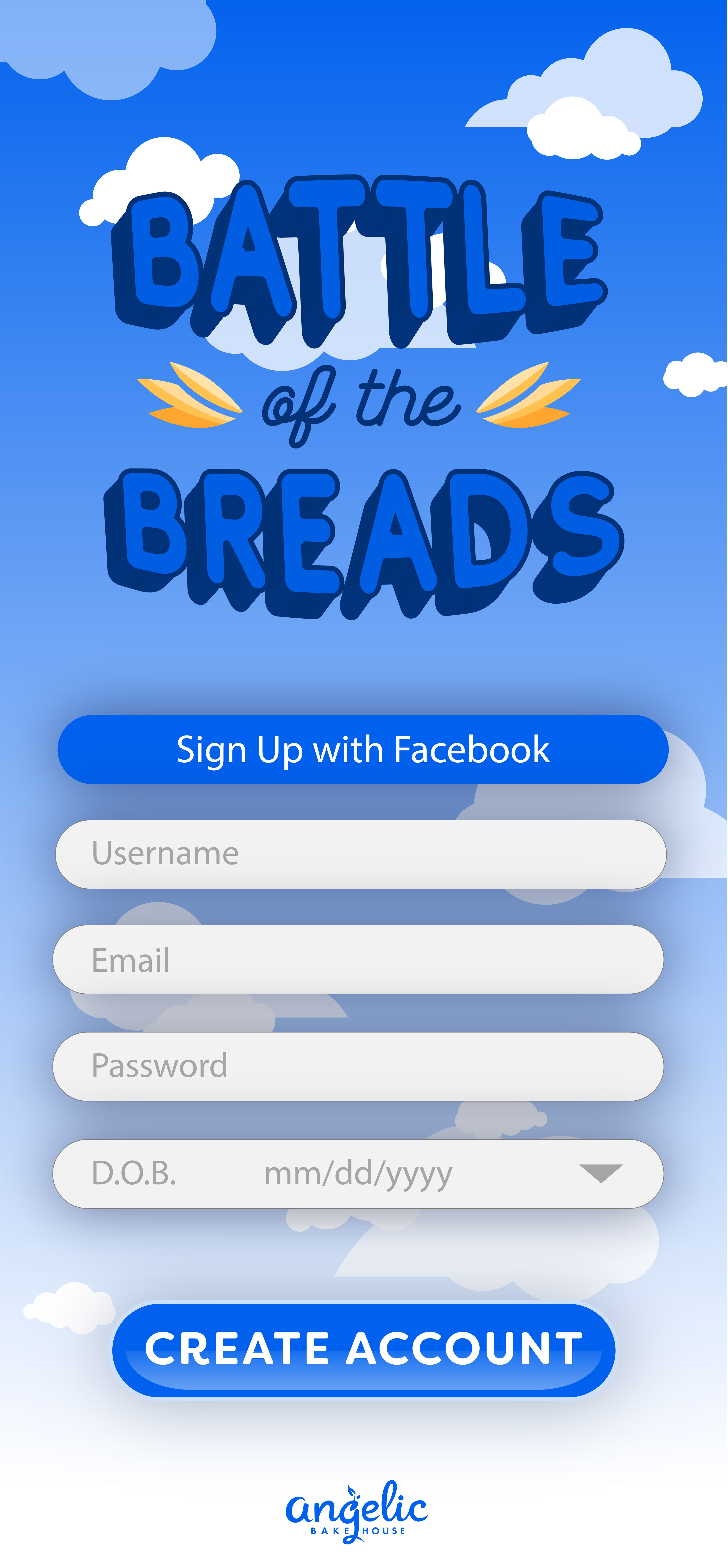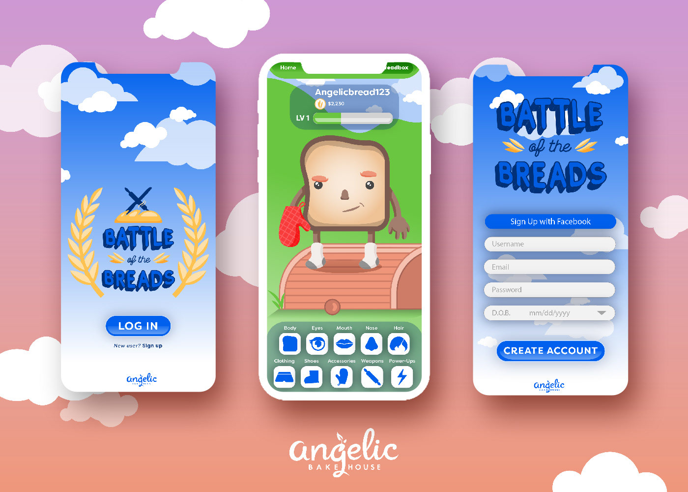 Mobile gaming application design for Angelic Bakehouse. User interface designs created in Illustrator and mocked up in Photoshop.