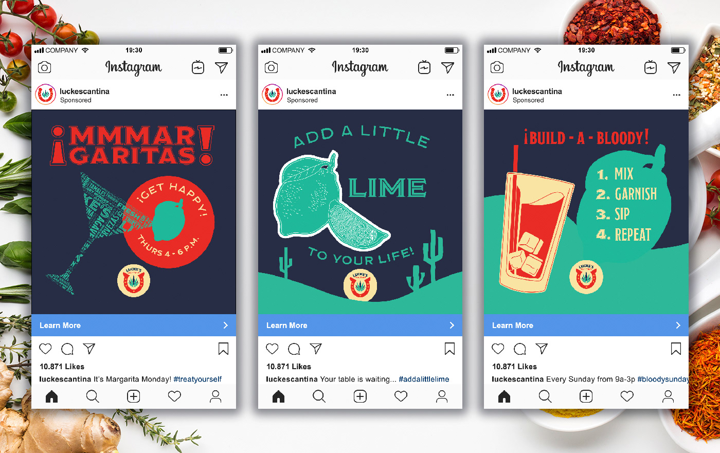 Self-initiated rebranding project for Lucke's Cantina restaurant in Williams Bay, WI. Process included a logo redesign and set of 3 instagram ads designed in Illustrator, and a menu redesign created in InDesign, printed, and photographed.