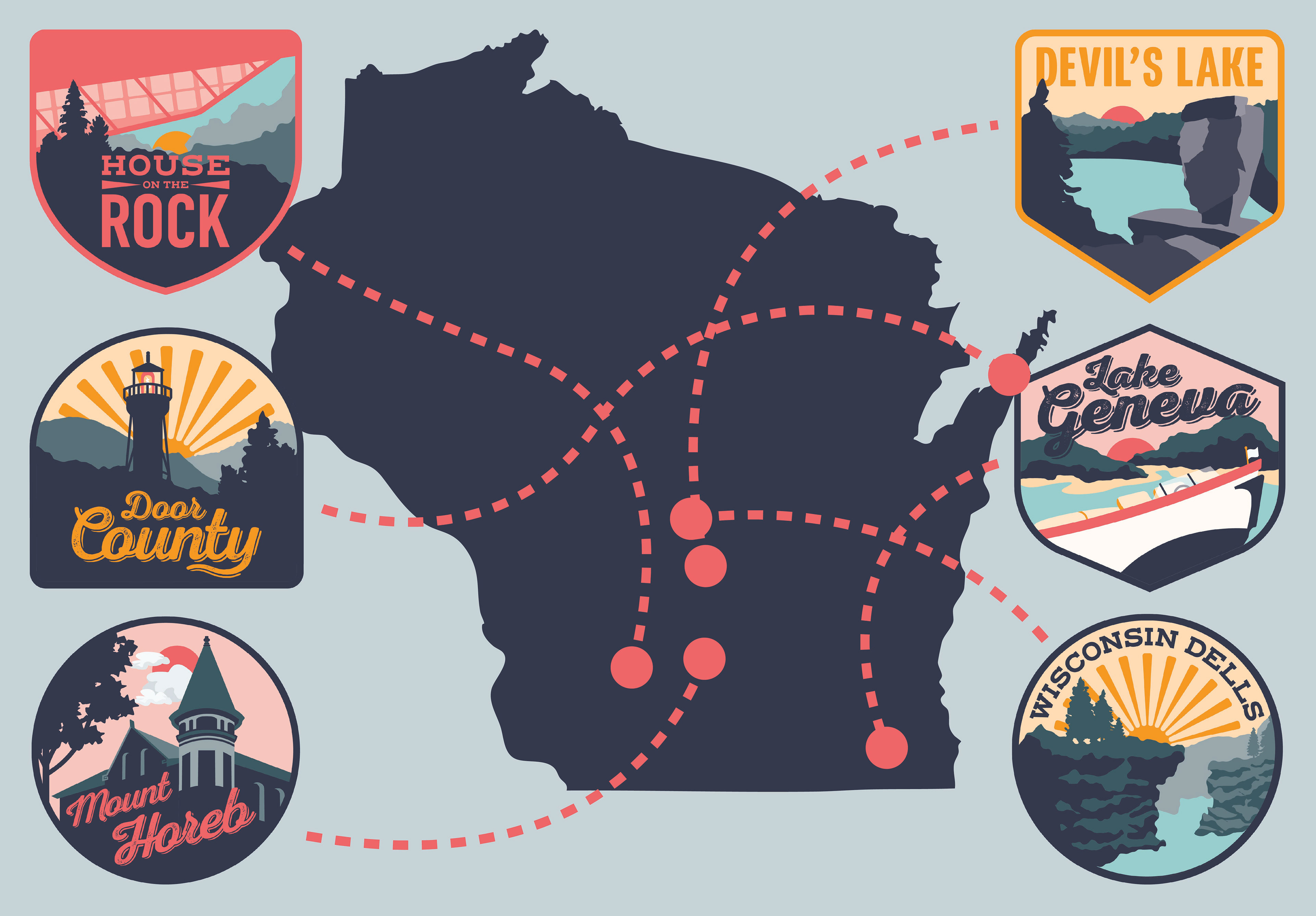Collection of typographic badge designs featuring popular Wisconsin travel locations. Designs sketched by hand and recreated in Illustrator.